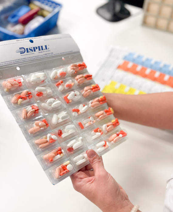 Dispill® is a personalized, pre-sorted blister pack that groups all your medications by day and time of day: Morning – Noon – Evening – Bedtime Each pack is color-coded, labeled, and prepared by our pharmacists to make your life easier and help prevent missed or double doses.